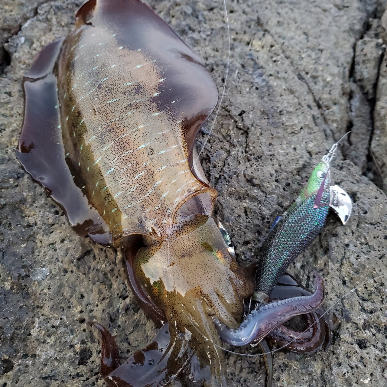 男鹿地磯へ8.9日の二夜連続夜中に釣行してきました(普通に仕事後からのまた仕事(笑)狂ってますね)今シーズンのアオリイカ釣行は地磯も沖磯も全て天気&海の状況も狂っていました(笑)なので鍛えられたのでしょうか?うねりの中でしっかりとアタリをとれた時の感動♪攻略が的中した後はキャストすれば必ず釣れるという自信の中で連チャン、抱いてるとこに他のアオリイカのエギ争奪戦!胴長20㎝超えもまだまだ小さい個体も一軍エギのパタパタ&マグパタ3.5号で完全ホールド♪9日夜はツ抜け達成も♪(≧▽≦)私もレベルupしたし(笑)楽しめました♪皆様も楽しんでください☆