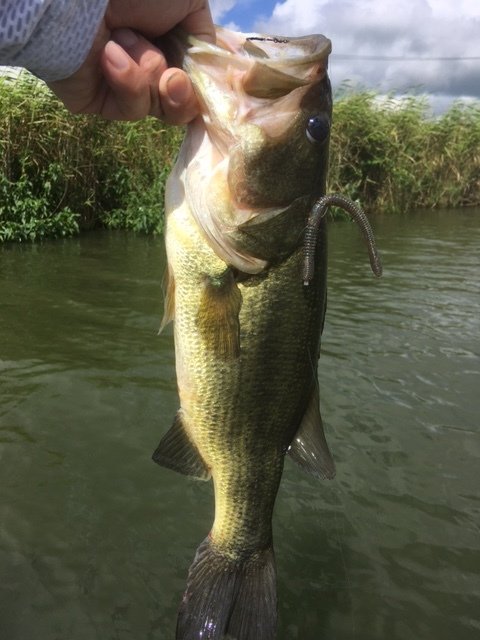 朝一入ったのは野田奈、いい感じの浮草のあるエリアにて野良ネズミ勝負、5発程出るも乗せられず...。W様は50cmほどの魚雷様をキャッチ。その後移動の小水路ではリプライさんのトラウト用チビハネ「ロウカス」で小バスやギル君に沢山遊んでもらい、またチョイ移動。その浮草エリアでまた野良さんを再開し2投目でい~い出方、画像のバスを浮草ごと引っこ抜きました。...まぁ、サイズは相変わらずな「俺」サイズな30cmでしたがw