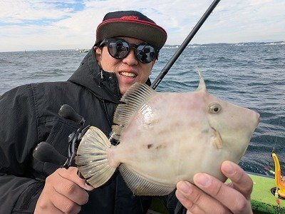 最初の流しでスタッフ大沼、24cm程とワッペンサイズの2枚掛け。鈴木も「FUNEスタイルカワハギ」を駆使し、旬のカワハギ釣りを楽しみました。仕掛けの誘いだけでなく、針のサイズ形・形状、集器を変えるだけで、アタリが出るゲーム性がとても楽しかったです。