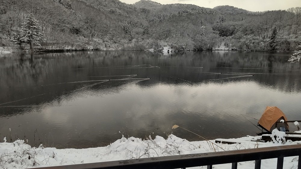 当日はガッツリ雪模様につき計4名の釣り人。池への到着は10時頃。例年とは違い水量が満水に近く出っ張りにはすでに二人釣り座を構えていて入座できない状態ですが堰堤はほとんど空いてます笑