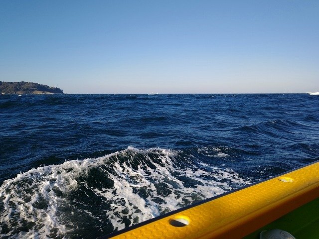 時折冷たい雨が打ちつける爆風の中(汗)剣崎松輪港から出船。