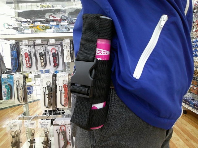 スプレーのみとホルダー付きの2アイテム展開で、ホルダーはこのようにベルトなどに通して固定することが出来るので邪魔になりません。