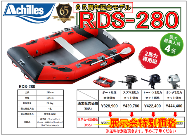 アキレス65周年記念モデル「RDS-280」1人でも操作しやすいコンパクトさでありながら最大4名の乗船が可能な2馬力専用艇!