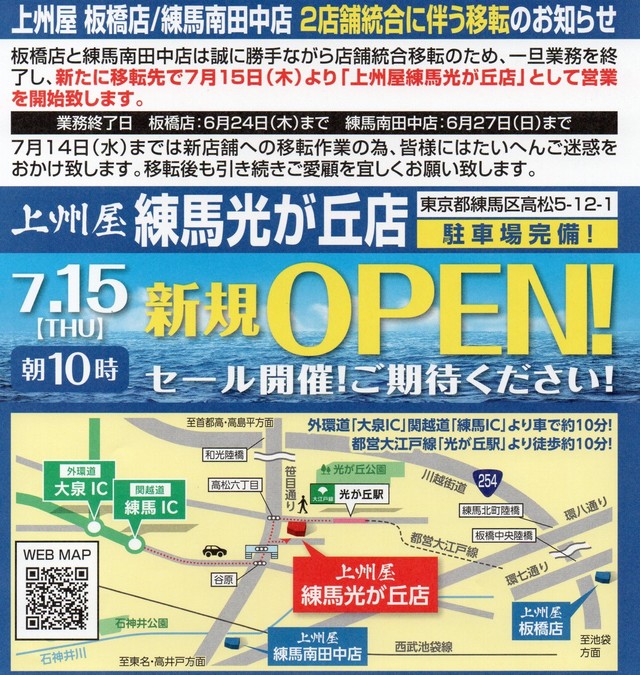 上州屋練馬光が丘店は2021年7月15日(木)新規オープン!どうぞご期待ください!移転先となる練馬光が丘店については、下記リンク先より詳細をご覧いただけます。