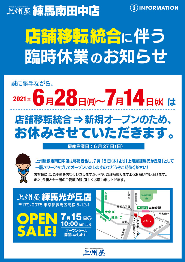 この度、当店こと上州屋練馬南田中店は、板橋店との店舗統合移転のため、2021年6月27日(日)をもって現住所での営業を終了し、移転先にて上州屋練馬光が丘店として新たに営業を開始させて頂くことになりました。