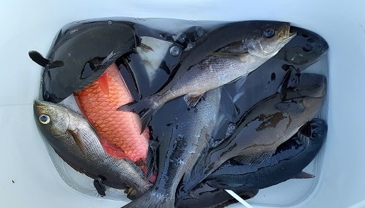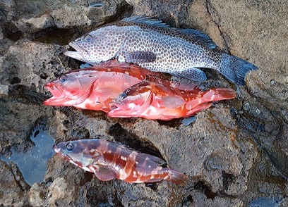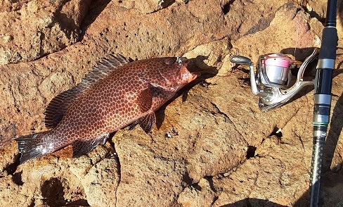 磯釣りの片手間にロックフィッシュ狙いも、俗にいう直リグ(20g前後)にワームを付けてキャスト、海底ずる引きで竿先をひったくるような強烈バイトで釣れたのはお久しぶりの大型オオモンハタ45cm、その後もワームを替えながら探ってポツポツとアタリがありアカハタ5匹キャッチ(小型はリリース)やってみると意外と楽しい高級魚ハタ狙いの磯ルアーもオススメです!