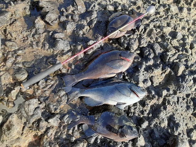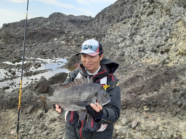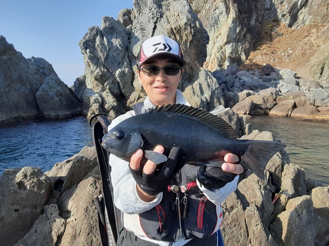 釣行2日目は下田、田牛沖磯へ。今期最強寒波襲来の1日目、爆風の西風15mのなか何とか安全な地方の沖磯へ無事渡礁、前半戦はこの風との戦いでした・・・風がおさまってきたお昼前からポツポツ本命メジナからのアタリをもらえ水中ウキとの2段仕掛けで良型3匹キャッチ、潮が流れ出す瞬間に鯛系特有の首振りファイトをいなして良型のクロダイもキャッチ。(場所がらマダイにもちょっぴり期待が・・・)潮が流れ出してからの上がり間際に潮筋を流している仕掛けに竿引きの強いアタリで釣れたのが当日最大39cmの良型メジナでした。午前中は強風でどうなるかと思いましたが何とかお土産キャッチできました。両日共に低水温でアタリは非常に渋く、少ないアタリをいかにかけ合わせられるかがカギとなります。寄せ餌との同調、ウキの感度と小針はマストです。