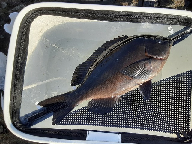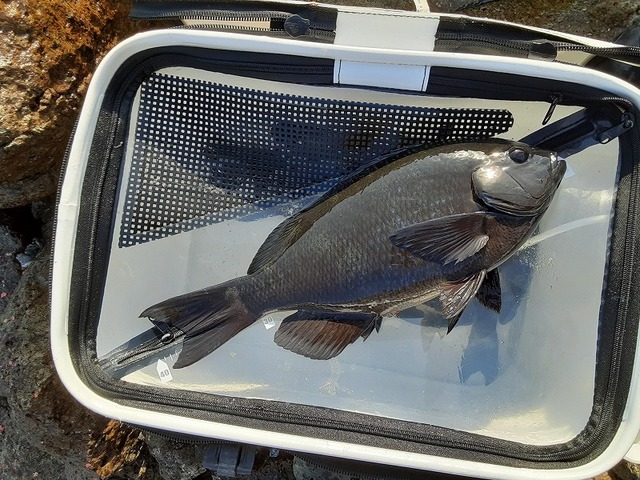 39cm良型メジナキャッチ。ぽかぽか日和で上着脱ぎました。