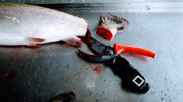 無事赤身トラウトをゲットできたら、無駄にATP(熟成でうまみ成分(IMP)にかわるエネルギー)を消費させないよう「津本式ハサミ」の絞めツノで脳締めします。