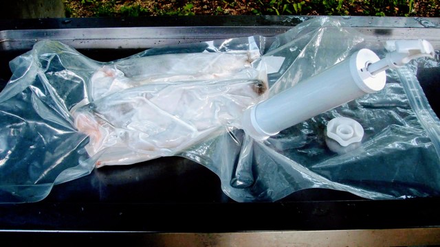 栄養(血・内臓)を完全除去したら、空気と水を切るためにおさかな圧縮袋で脱気します。