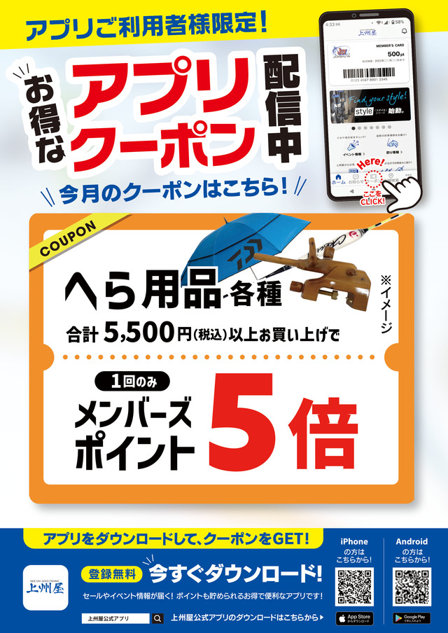上州屋アプリ会員のお客様☆3月のお得なアプリクーポンを使って、へらバック!?
