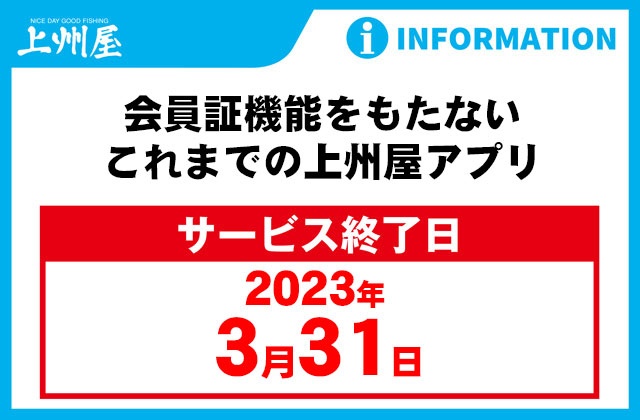 会員証機能をもたない、これまでの上州屋アプリにつきましては、誠に勝手ながら2023年3月31日をもってアプリサービスの提供を終了させて頂きます。