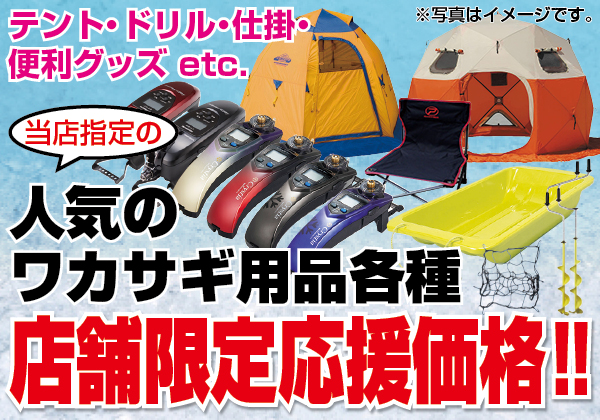 ワカサギテント・アイスドリルなどの氷上ワカサギ用品を始め、電動リールやワカサギ仕掛もお買い得!!