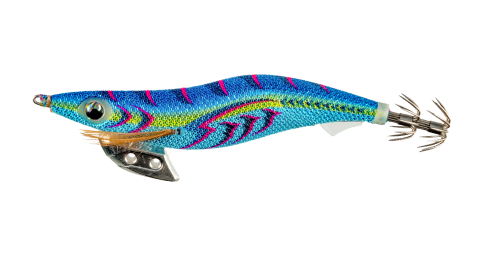 日中の澄潮で活躍する青ボディに潮馴染みを意識した配色。青い光の反射が広範囲のイカに存在を認識させ、ピンクの差し色で艶めかしくアピールする。