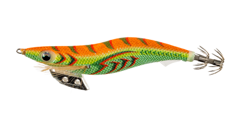 濁り潮に馴染む緑のフラッシングボディにイカへのアピールを意識したオレンジの組み合わせ。赤のアクセントも加わり、アングラーからの視認性も抜群。
