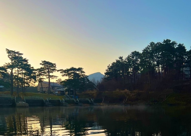 日の出を迎えた幻想的な桧原湖上のドーム船へ