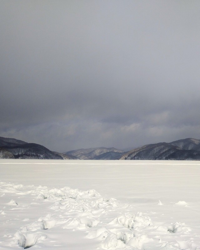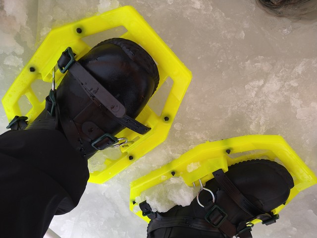 現状、事業所さんが作ったモービル道は歩きやすいですが、道から反れると、湖面には約20~30cmの新雪が積もっており、その下はぬかるみますので、カンジキやスノーシューの持参した方が良いです!