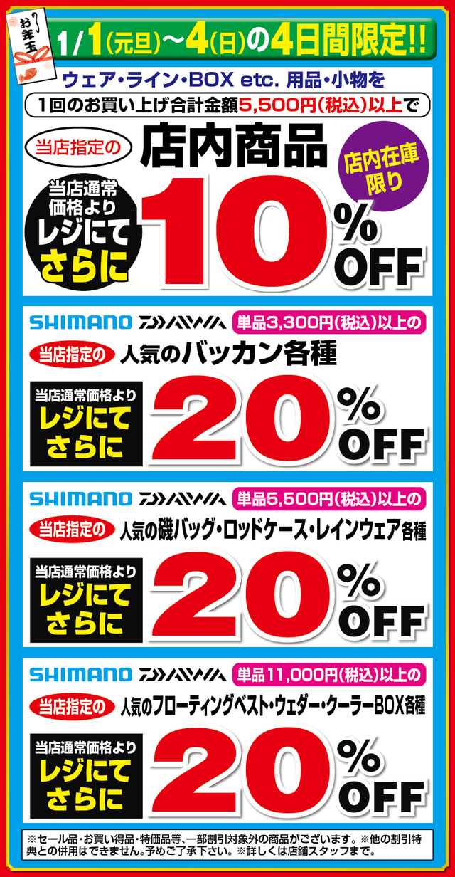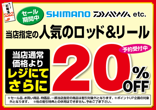 初売りセール期間中、青森県内上州屋3店舗にてSHIMANO、DAIWAなど当店指定のロッド&リールが当店通常価格よりレジにてさらに20%OFF!
