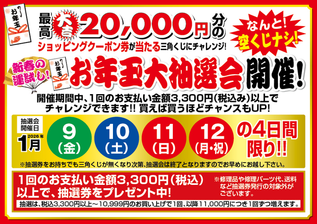 1月9日(金)、10日(土)、11日(日)、12日(月/祝)の4日間限定、最高大吉20,000円分のショッピングクーポン券が当たる、お年玉大抽選会を開催致します!なんと空クジなし!開催期間中、上記抽選券をご持参、もしくは1回のお支払い金額3,300円(税込)以上でその場でチャレンジいただけます!