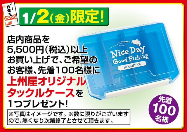 【1月2日(金)限定/先着限定数100】青森県内上州屋3店舗にて店内商品を5,500円(税込)以上お買い上げでご希望のお客様、先着100名様に上州屋オリジナルタックルケースを1つプレゼント!