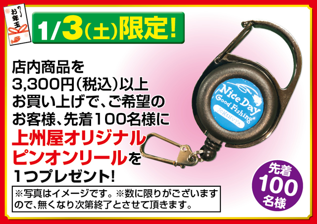 【1月3日(土)限定/先着限定数100】青森県内上州屋3店舗にて店内商品を3,300円(税込)以上お買い上げでご希望のお客様、先着100名様に「上州屋オリジナルピンオンリール」を1つプレゼント!