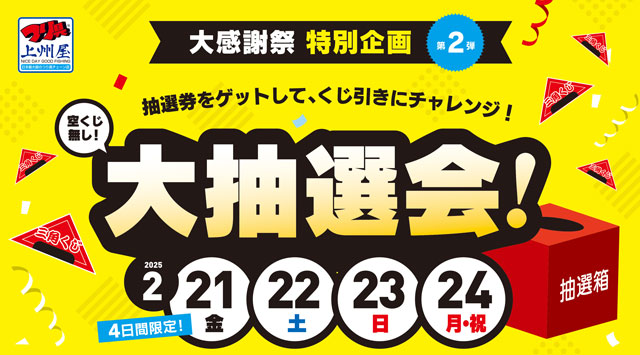 大感謝祭特別企画〔第2弾〕2/21(金)~2/24(月/祝)4日間限定「大抽選会」抽選券配布中!