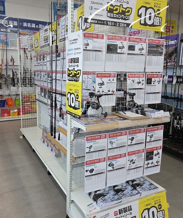 キャンペーン期間中に店頭売価11,000円(税込)以上のシマノ、ダイワ、アルファタックル、テイルウォークの2026新製品ロッド&リールをご予約いただくと、ご精算時にメンバーズポイント最大10倍!