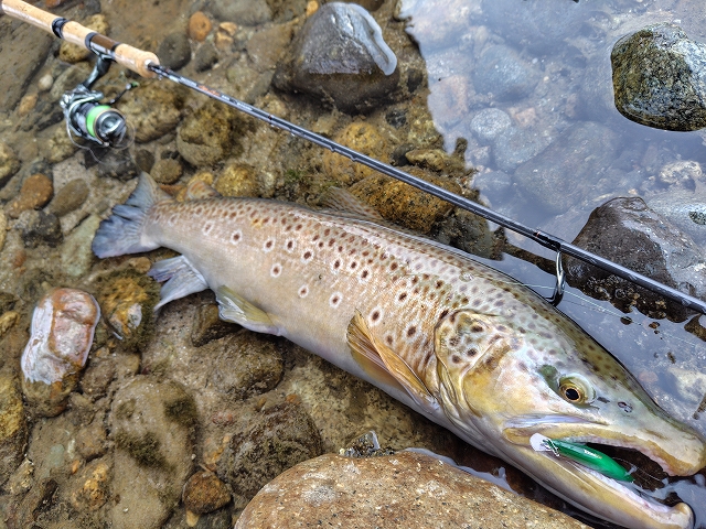 でも川をみると超クリアーで水も少なかったです。あまり期待はしていなかったのですが、5投目位で軽くトウィッチをいれていたミノーの動きが「グッ!」と止まって、バイト!