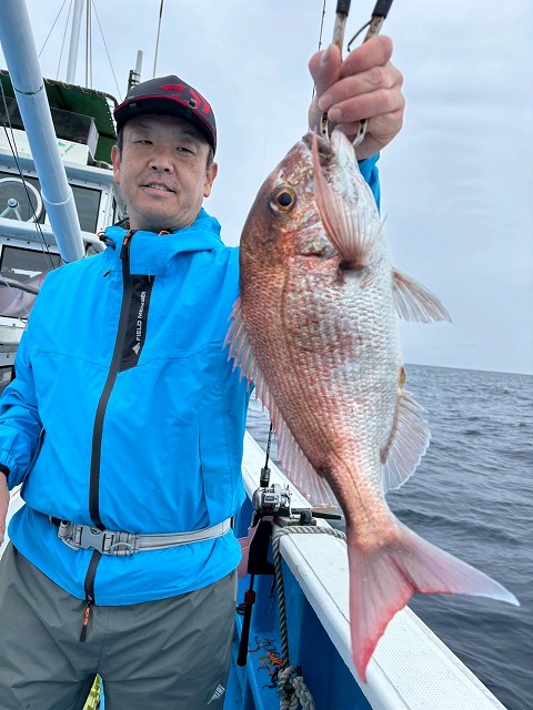 カンパチのあとで楽々巻き上げタモ入れ成功。こちらは、本日2枚目のマダイ(お客様とマツってしまい針を外して撮影)。