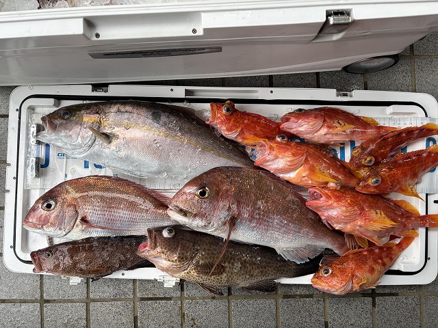いろいろ試すも無反応な時間が続きます。ご一緒したお客様は、ビンビンスイッチキャンディーで丁寧に探って行くとアオハタやアヤメカサゴ、オオモンハタと根魚タイムもあり、クーラーボックス内は、賑やかに。
