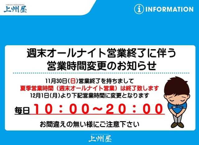 11月30日(日) オールナイト営業~20:00まで
