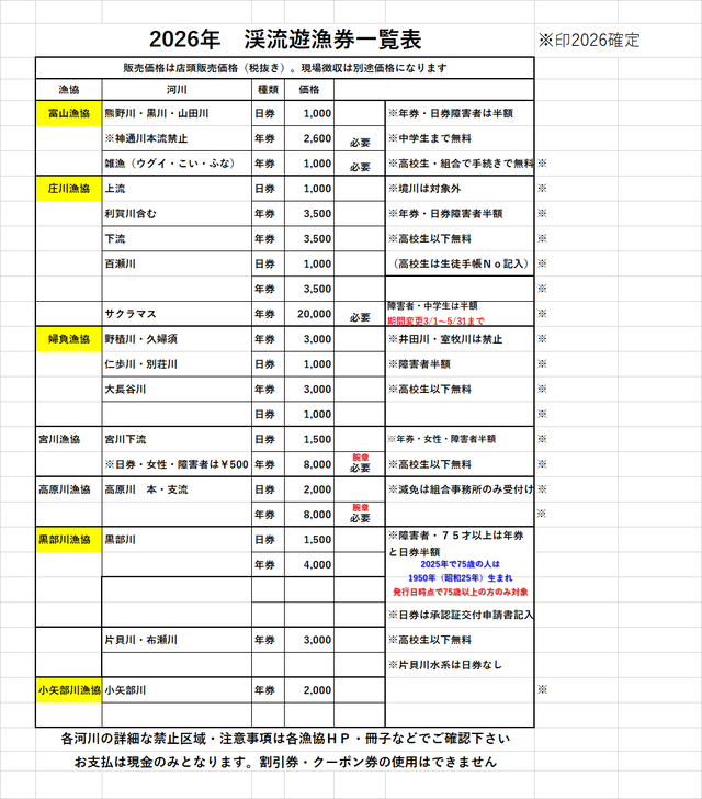 婦負(ねい)漁協雑遊漁券入荷しました!