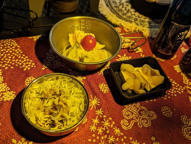 居酒屋「小島」開店です(笑)まずは簡単なお通し3種。「大人のポテサラ」「冷奴のたこわさのせ」「おろしシラス」こういうのが一番進むよね♪
