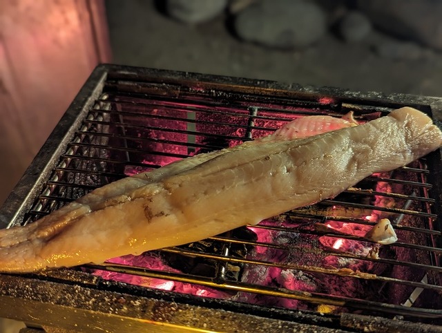 ほっけを炭火で焼く→おろしで食べる→色々と進む!最高な夜!(^^)!3切れあって全部焼いて食べちゃった♪さすがに腹パンなので居酒屋「小島」閉店(笑)