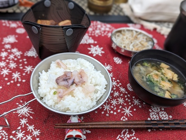 美味しくご飯が炊けたときは和定食!(^^)!昨日食べるつもりだった豚の角煮(レトルト)とフリーズドライのお味噌汁。昨晩の残りのたこわさをご飯にのせて。外で食べるご飯は本当に美味しい!