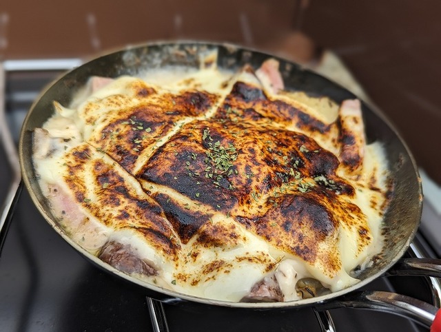 ランチは市販のグラタンソースで作ったベーコンポテトグラタン♪SOTOさんの「フィールドチャッカーST‐450」があればチーズのもこの通り!めっちゃ美味しそうに出来上がりです♪実際のお味は「牛乳でソースを伸ばし忘れで味がかなり濃ゆい」グラタン...でも美味しかった!