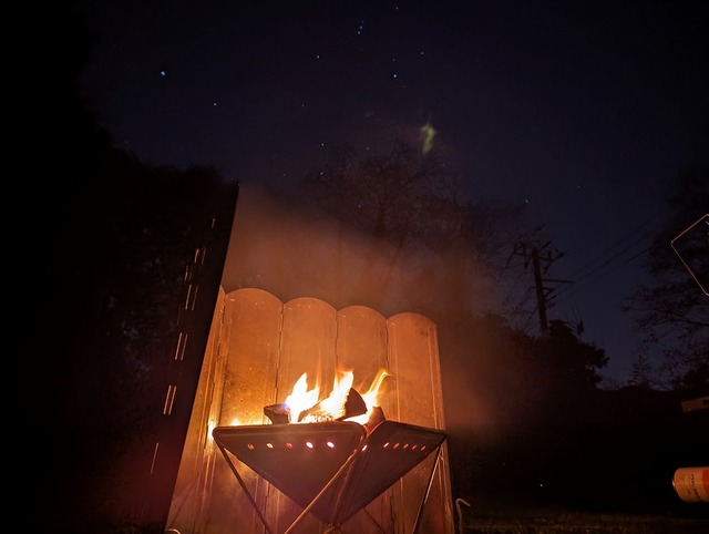 焚き火と星空♪この日の焚き火も楽しかった♪周りは本当に静かで「パチパチパチ」と薪が燃える音だけが聞こえる夜でした。ソロキャン、本当に癒されるっ!