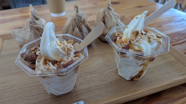 帰る前に、もういっちょ食べておきますか...♪「Asama Hutte」のキャラメルナッツソフト!実は前日にも食べてる笑。あまりにも美味しすぎる!これを食べるために、小島はまたスウィートグラスに伺いたい!