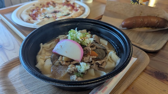 そして!上州名物地粉太うどん「豚汁おきりこみ」がこの日の晩御飯になりました!山梨名物「ほうとう」に似て非なるうどん!ほうとうよりうどんが柔らかい感じ?とっても美味しくかつ!ボリュームが凄い!太うどんのせいか腹持ちがいい!友達はマルゲリータ、もう一人の友達は粗挽きフランクを!どちらも美味しそう...♪
