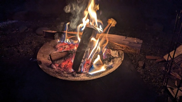 焚き火台はコールマン「ファイヤーディスクソロ」。焚き火台のサイズに全く合わない長く大きい薪をいじり倒すのが、最高に楽しい!