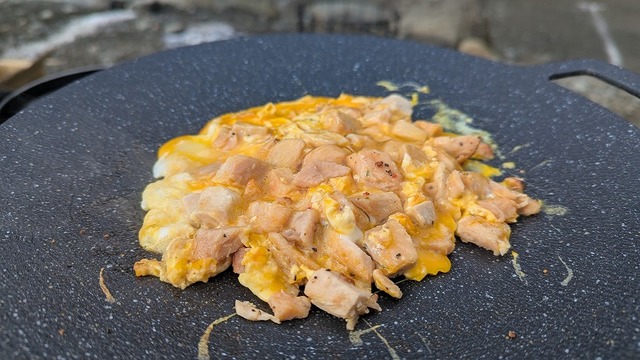 小島は1食材とし使います。万能スパイス「ほりにし」でサラダチキンを軽くソテー。卵でとじて「チキンオムレツ」完成!(写真はまだ調理途中ですね)肉感がしっかりあって大満足でした!
