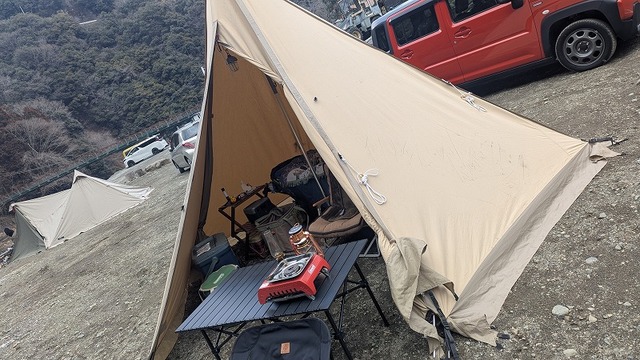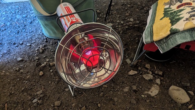 翌朝気温は-2℃ほど。朝はやはり冷え込みますね。ので出動しております「アウトドアヒーター」♪あるとないとでは雲泥の差!この後お菓子を食べて10時過ぎに撤収しました。