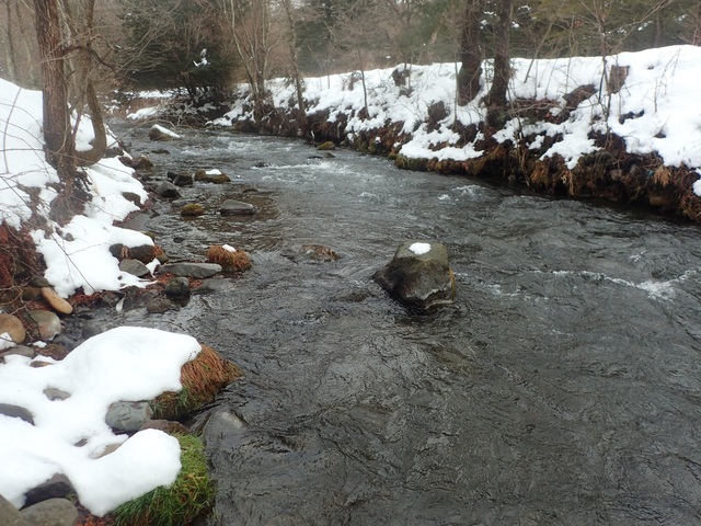 現地には8時前には着いたのですが結構雪が残っており駐車する場所が全然無かったので仕方なく下流部に駐車して歩いて川へ向かいました。
