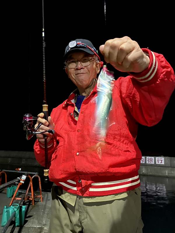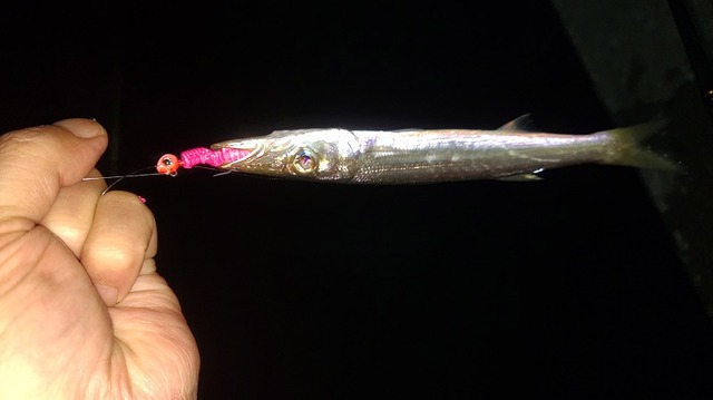 この時期カマスが居ることが多く、もしかしたらと思いメバリングの竿にジグヘッドとワームをセット、街灯が水面を照らす明るい所と暗い所の境目を引いて来ると1投目から20㎝ぐらいのカマスがヒット!