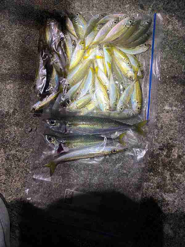 サビキ釣りは1時間ほどでこれぐらいの爆釣状態(釣り人1人分の釣果)、釣り入門者3人は狂喜乱舞状態で釣りを楽しんでいました。