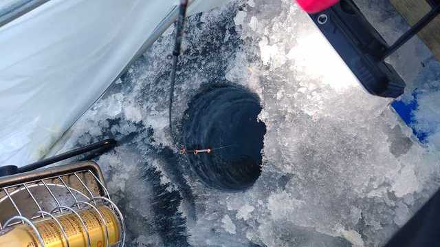太陽が顔出す頃まではテントの中が暗いので、明るいホタルイカ用のLEDライトを持ち込んで竿先を照射、小さなアタリを逃さないように目を凝らします、亀田が下手くそなだけなんですが0.5号のハリでは巻き上げてくる途中にバレてしまうことが10回近くありました、前回同じような場所に入った時も大きいワカサギが多くバレてしまう事が連発したのでオモリの下に付けてる下鈎は1号にしてみました。