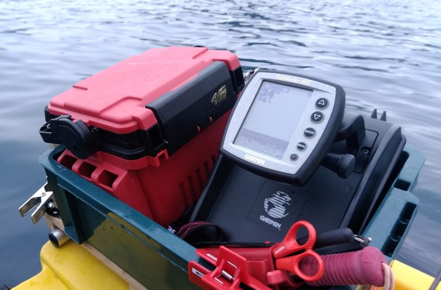 魚探の設置ですが、私のボートエース23の場合はサイドフロート上のコンテナBOXに入れています。