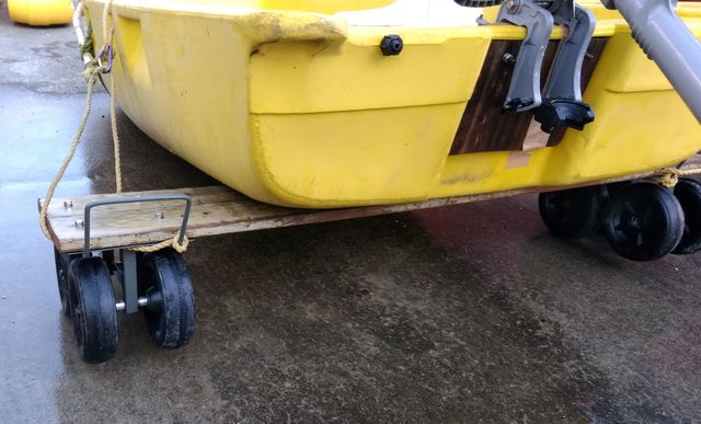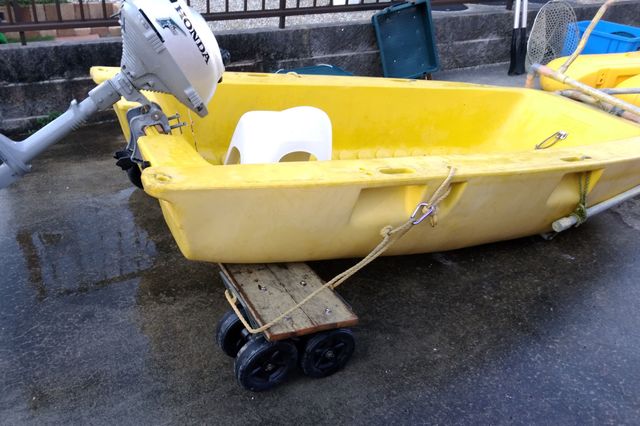 以前は、船底につけた塩ビパイプに台車(木の板に小さな車輪がいくつか付いたもの)をロープで固定しただけのもので、砂地以外はなかなか便利でしたが、常時付けっぱなしの為、4、5年で錆びて崩壊。