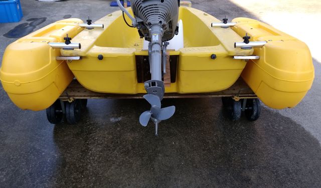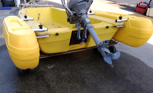 画像ではサイドフロート、エンジンだけですが、コンテナやクーラー、ロッド類など、すべての装備を積載して運ぶことが可能になりました。