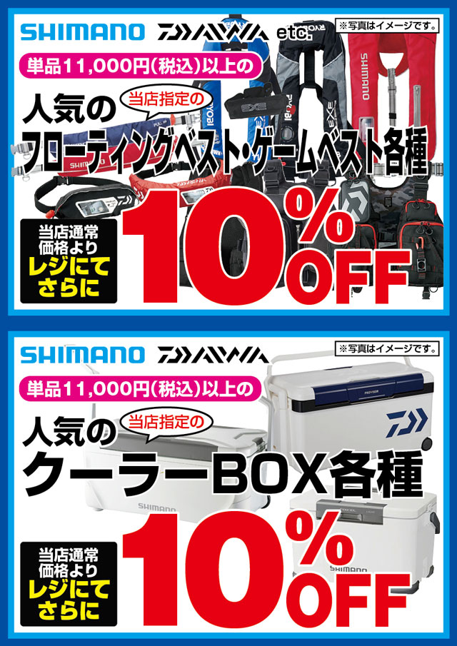 3月13日(木)からのオープンセール期間中、シマノ、ダイワetc.当店指定単品11,000円以上のフローティングベスト・ゲームベスト各種、クーラーボックス各種が、当店通常価格よりレジにてさらに10%OFF!